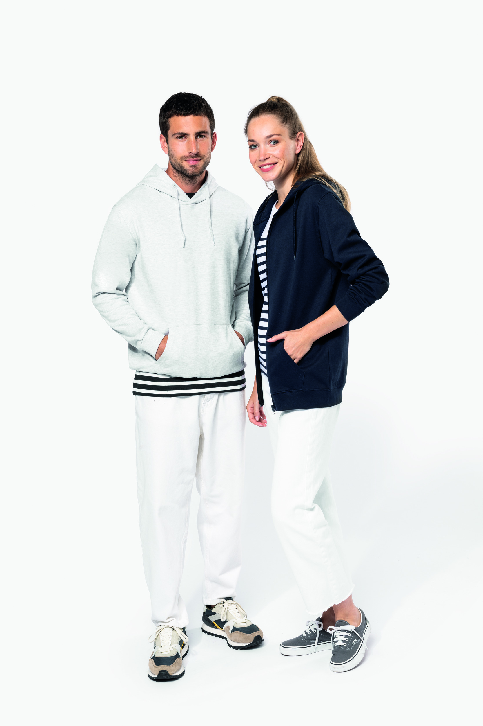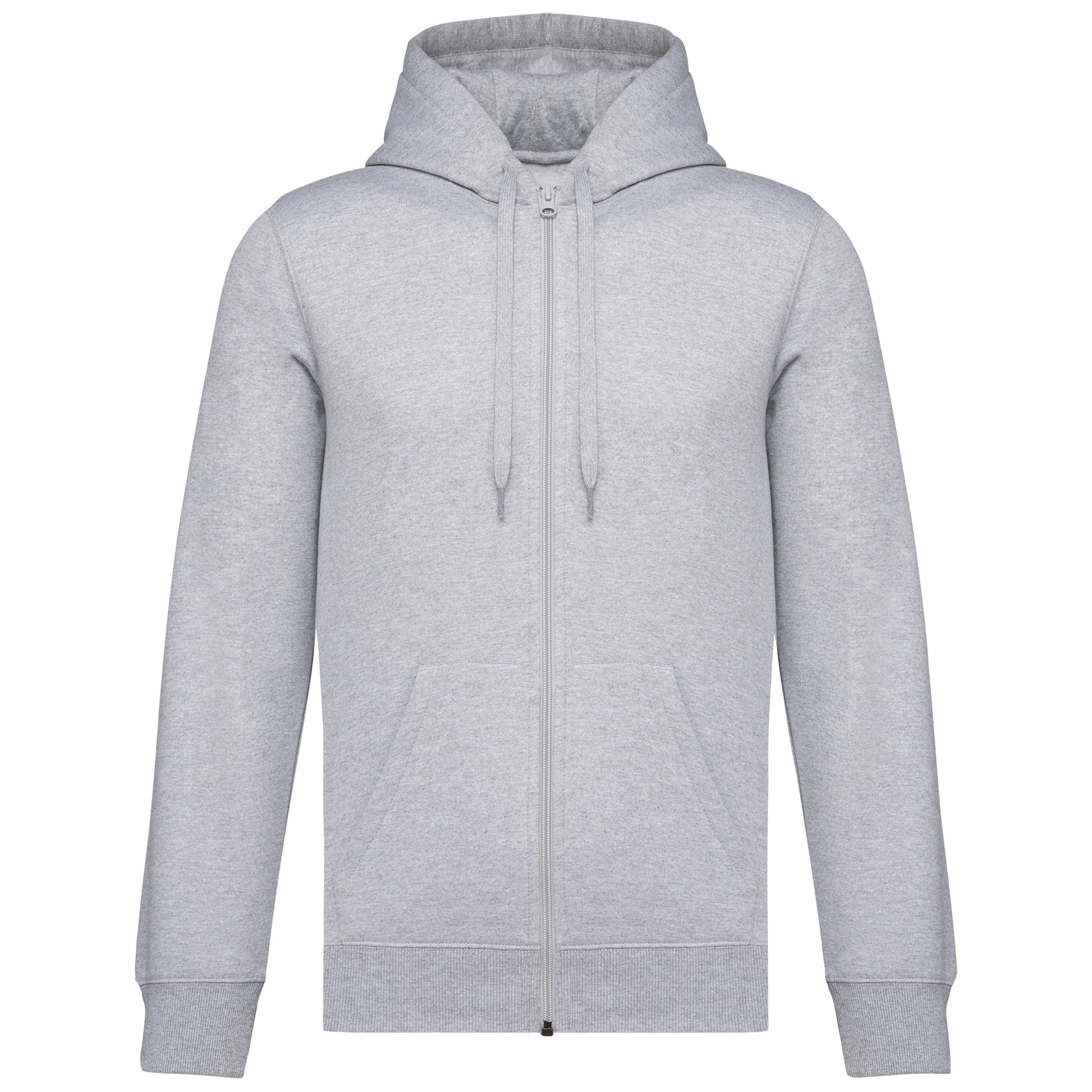 50% coton ring-spun / 50% polyester recyclé post consumer. Molleton gratté. Coupe straight. Coupé cousu. Bord-côte 2×1 montage tubulaire pour une meilleure finition au col, bas de manches et de vêtement. Poche kangourou. Zip de fermeture en nylon. Capuche doublée polycoton jersey avec cordon de serrage plat. Bande de propreté jersey ton sur ton à l’intérieur du col. Pas d’étiquette de marque au col, uniquement une puce de taille pour faciliter la personnalisation.
